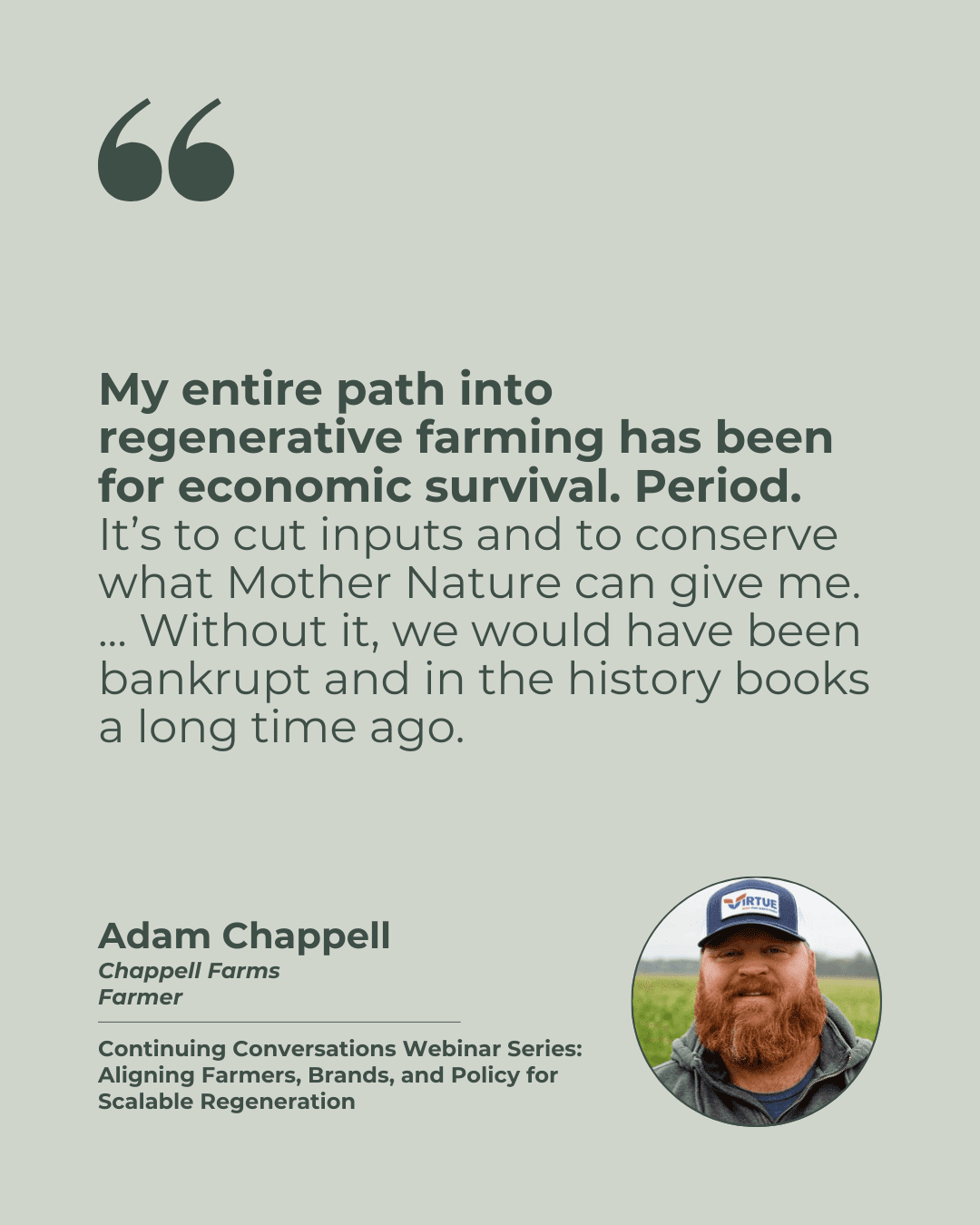 - Adam Chappell — A fourth-generation farmer from Arkansas, Adam turned to regenerative agriculture out of economic necessity. He offers a firsthand account of battling high input costs and a commodity system that often works against growers.